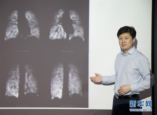 在中科院武汉物理与数学研究所,周欣在肺部气体磁共振成像图前留影(4月19日摄)。新华社记者 金立旺 摄