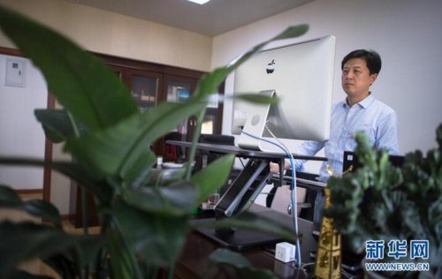 在中科院武汉物理与数学研究所办公室,周欣站在特制的工作台前办公。因为工作时间长、压力大、久坐等因素曾经导致他的腰椎间盘突出,站着办公可缓解病痛(4月16日摄)。新华社记者 肖艺九 摄