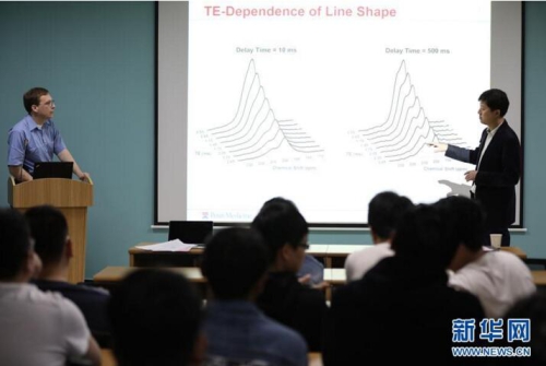在中科院武汉物理与数学研究所举行的MRI与造影剂前沿论坛上,主持人周欣(右)与来自宾夕法尼亚大学的专家讨论学术问题(4月17日摄)。新华社记者 金立旺 摄