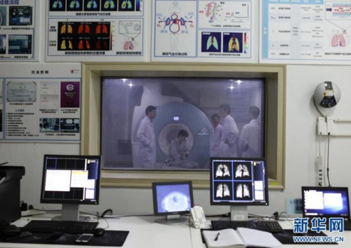 在中科院武汉物理与数学研究所波谱与原子分子物理国家重点实验室,周欣在人体成像仪前检查受试患者准备情况(4月18日摄)。新华社记者 金立旺 摄