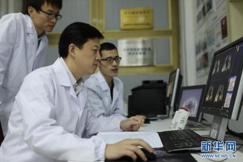 在中科院武汉物理与数学研究所武汉国家磁共振中心,周欣(中)和同事讨论肺部气体磁共振成像的质量(4月18日摄)。新华社记者 金立旺 摄