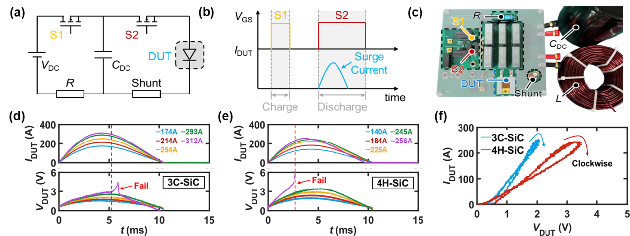 图4 (a) 电路示意图,(d)理想波形和(c)浪涌电流测试装置的照片。不同浪涌电流水平下(d)4H/3C-SiC工程衬底和(e)4H-SiC衬底上SBD的电流和电压波形,分别显示在312 A和256 A峰值电流下发生故障。(f)使用最终安全耐受波形重建I-V特性。