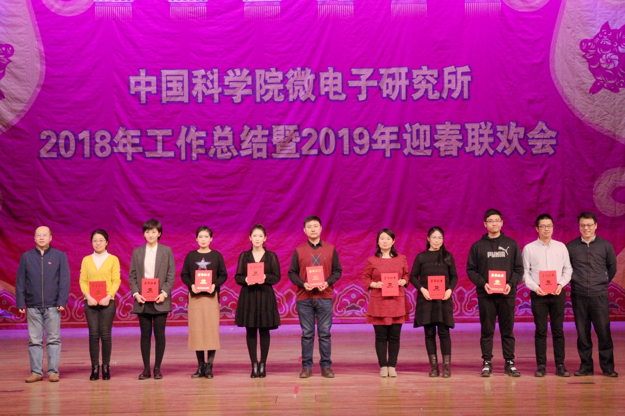 在表彰环节,戴博伟宣读了微电子所2018年度先进集体、先进个人表彰名单。叶甜春、王宇、周玉梅、陈大鹏、刘新宇、赵志刚,吴德馨院士、刘明院士、韩郑生总工程师分别为微电子所2018年度科研成果奖、先进集体、先进工作者和优秀研究生特等奖获奖者颁奖。