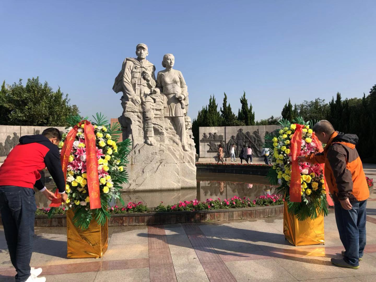 缓步走进庄严肃穆的瞻仰广场,映入眼帘的是“郭建光”、“阿庆嫂”的形象创作的巨型主雕屹立在广场中央。广场两侧是象征新四军18个伤病员的18根柱雕,以形态各异的块面造型和强烈的肌理效果对比,淋漓尽致的表现出新四军伤病员泰山压顶不弯腰的革命精神。两组锻铜浮雕以细腻、生动的构图和丰满的人物形象,演绎深化了军民雨水深情的主题。大家认真聆听了江南抗日义勇军历史发展过程,细细体味着战争年代革命先烈艰苦卓绝的革命生活和血浓于水的军民之情。作为革命教育基地,随处可见的党旗、国旗迎风招展,进一步激起了大家爱党、爱国之情。大家面对鲜红的党旗,重温了入党誓言,细细品味这片革命先烈曾经洒下热血的“红土地”。