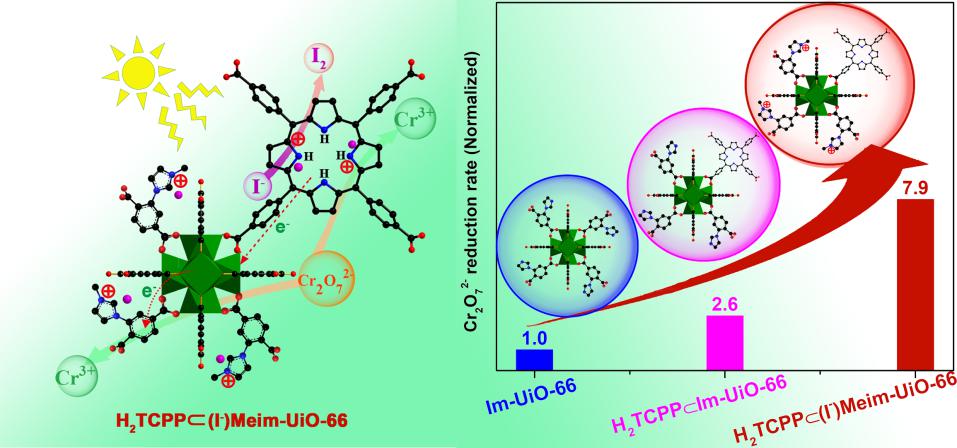 (I-)Meim-UiO-66中,由于该材料集宽可见光吸收能力的卟啉单元和强Cr2O72-吸附能力的阳离子结构于一体,有效地提高了Cr2O72-的光还原能力,并达到了MOF基材料可见光还原Cr2O72-的最高速率(13.3mgCr(VI)/gcatalyst/min),远高于传统MOF光催化剂,包括NH2-UiO-66(0.2mgCr(VI)/gcatalyst/min)和NH2-MIL-125(1.6 mgCr(VI)/gcatalyst/min)。结合实验表征和理论计算,作者提出了多元H2TCPP