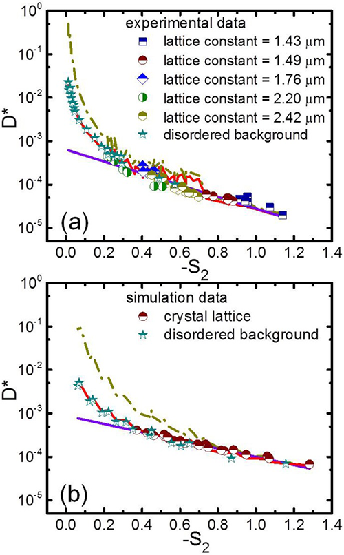 图2. 示踪荧光粒子的无量纲扩散系数D* 与两体结构熵 S2 之间的普适关系。a)实验数据与理论拟合,b)模拟数据与理论拟合。