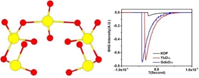 REI5O14 (RE= Y and Gd) 结晶于极性空间群Cm。其中I5O14由三个IO4和两个IO3通过共顶角连接形成半圆形构型,具有较高的极化率。I5O14基团在单胞排列整齐,因此YI5O14 和GdI5O14均展现出了优异的倍频性能,分别为KDP的14倍和15倍。理论计算表明,I5O14多聚体对于YI5O14和GdI5O14倍频性能的贡献率分别为91.28%和92.62%。此外, 这两个晶体在可见到中红外波段均具有很好的透过性能。同传统的水热合成相比,磷酸能够有效地增强反应媒介的粘稠度,从而有利于碘酸根的聚合。该研究结果有望为碘酸盐NLO晶体的设计与合成提供一条简便有效的新策略。