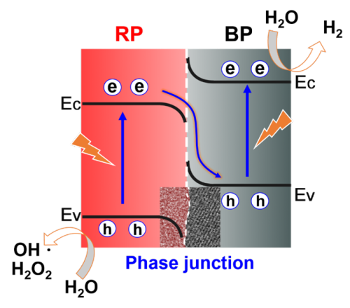 近期,中国科学院理化技术研究所光化学转换与合成研究中心研究员陈勇团队以红磷为原料,一步法原位制备了黑磷/红磷异相结光催化剂。研究人员发现,利用乙二胺、己二胺等作为反应溶剂,可以在温和的条件下控制红磷到黑磷的部分转变。该方法巧妙构建了黑磷/红磷异相结,实现了不同半导体之间完美的界面接触,促进了光生载流子的分离,最终实现不加任何牺牲试剂条件下的光催化分解水产氢。通过与中科院物理研究所研究员翁羽翔合作,研究人员利用时间分辨的瞬态吸收光谱研究光生载流子的动力学行为,揭示了光激发过程中电子从红磷到黑磷转移的Z-scheme机制。
