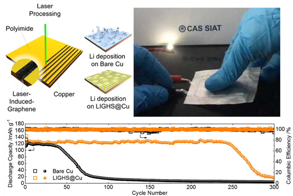 8月21日,中国科学院深圳先进技术研究院光子信息与能源材料研究中心电化学团队在长效锂电金属池方向获得新进展。相关成果以《快速模板化制备激光诱导石墨烯用于高稳定性快速形核锂金属电池》(Facile Patterning of Laser-induced-Graphene with Tailored Li Nucleation Kinetics for Stable Lithium Metal Batteries)为题发表在期刊《先进能源材料》(Advance Energy Materials)上,文章的第一作者是硕士研究生羿井司,通讯作者是助理研究员陆子恒和研究员杨春雷。