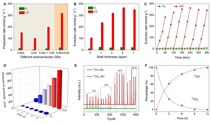 图2. 量子点光催化还原CO2。(A)不同半导体量子点作为光催化剂的光催化CO2还原反应速率。(B)相同条件下,不同CdS壳层厚度修饰的CdSe量子点的光催化CO2还原速率。(C) 催化剂的循环利用。(D) AM1.5光照。(E-F) 13C标记实验。