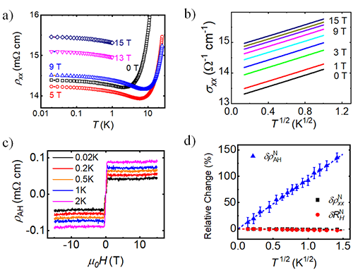 图2. HgCg2Se4中反常霍尔效应的反常温度依赖关系。(a) 低温下纵向电阻率ρxx的温度依赖关系;(b)纵向电导率σxx对\(\sqrt{T}\)具有线性依赖关系,其斜率不随磁场变化;(c) 不同温度下的反常霍尔电阻率ρAH;(d) 纵向电阻率、正常霍尔电阻率和反常霍尔电阻率都呈现\(\sqrt{T}\)型的温度依赖关系,但反常霍尔电阻率的相对零温数值的变化率超过前二者约两个数量级。反常霍尔电导率的相对变化率具有相近的数值。