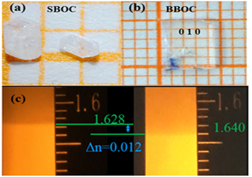 最近,中国科学院新疆理化技术研究所特殊环境材料与器件重点实验室研究员潘世烈带领的团队一直致力于探索大双折射材料及产生大双折射率的来源机制,通过对首例Sn2+的硼酸盐氯化物Sn2B5O9Cl和同构碱土金属硼酸盐的双折射率测试研究,首次从实验上证明拥有立构活性的Sn2+能够激发双折射率的大幅增益。团队研究人员在密闭体系下得到了Sn2B5O9Cl晶体(1 × 1 × 0.5 mm3),并且通过顶部籽晶法得到同构的Ba2B5O9Cl晶体(5 × 4 × 1.0 mm3),借助偏光显微镜和宝石折射率仪测量了晶体的双折射率。实验数据和理论计算结果都显示出Sn2B5O9Cl拥有超大的双折射率(0.168@546 nm),其双折射率更是同构化合物Ba2B5O9Cl的16.8倍(0.010@546 nm)。