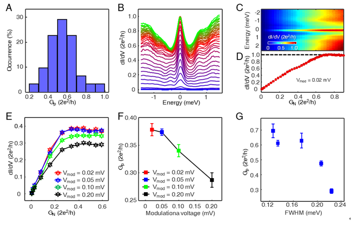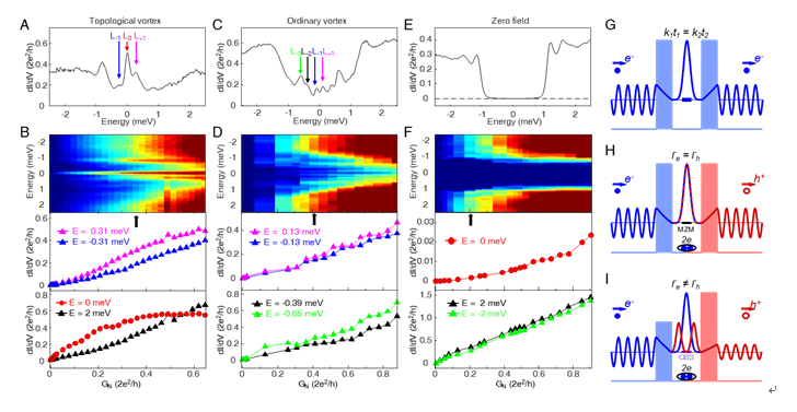已有的实验提供了马约拉纳零能模存在的大量实验证据,也解释了马约拉纳零能模存在的微观物理机制,但是在新奇物理现象丰富的凝聚态材料中,仍然需要更强有力的实验证据证明零能模信号来源于马约拉纳准粒子,例如,量子化电导平台的实验观测。在固体材料体系中,激发得到的马约拉纳准粒子具有本征的粒子-反粒子对称性,其电子与空穴的组成成分相等。在超导体材料的测量中,一个入射的电子必然会带来一个反射的空穴。超导体表面马约拉纳零能模的出现使得电子与空穴的隧穿概率相等并发生Andreev共振反射,产生独特的量子化的电导平台特征。该特征是马约拉纳零能模存在的关键性实验证据。