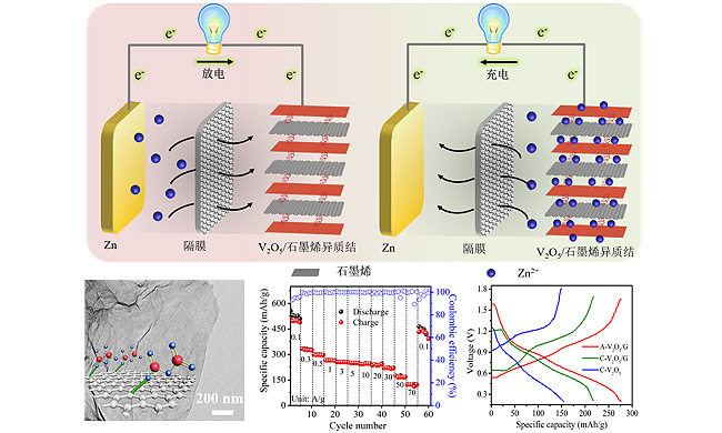 近日,中国科学院大连化学物理研究所二维材料与能源器件研究组研究员吴忠帅团队发展了一种二维模板离子吸附策略,制备出二维无定形V2O5/石墨烯异质结构新材料,实现了高效离子-电子协同传输,获得了高安全、低成本、高性能水系锌离子电池。