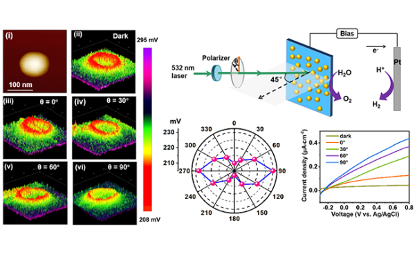研究团队利用自主研发的空间分辨的表面光电压显微镜直接给出可视化图像:发现表面等离激元空穴局域在Au/TiO2界面(J. Am. Chem. Soc., 2017)上。该团队在金纳米颗粒二聚体中,又发现耦合效应介导的等离激元电荷在纳腔的聚集现象,促进多质子参与的水氧化反应活性(Natl. Sci. Rev., 2020)。研究团队基于空间分辨的表面光电压显微镜,进一步发现表面等离激元光催化剂电荷分离的偏振效应。通过改变入射光偏振角度,该团队系统地研究催化位点局域的电荷浓度,得到最优的电荷分离偏振角度:当入射光的偏振角度垂直于光催化剂Au颗粒/TiO2界面时,表面光电压信号最大,电荷界面注入效率最高;结合角度分辨的散射光谱和理论模拟,初步探讨电荷浓度偏振依赖性的内在原因;利用水氧化催化反应作为探针反应确认偏振效应对催化活性的影响。该研究为等离激元光催化剂界面电荷分离的调控提供了全新的方法,也为等离激元性质的理解和开发提供了思考和认识。