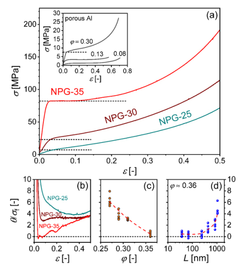 图1.纳米多孔金的压缩变形行为。(a)不同相对密度纳米多孔金的压缩应力应变曲线,小图为不同相对密度常规多孔铝的压缩应力应变曲线;(b)不同相对密度纳米多孔金归一化后的加工硬化率随压缩应变的变化情况;(c)纳米多孔金归一化加工硬化率随相对密度的变化;(d)相对密度为0.36的NPG-35样品的加工硬化率随孔棱尺寸的变化情况