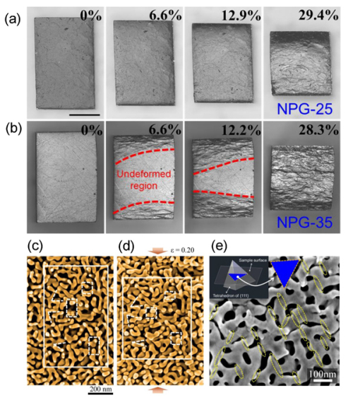 图2.纳米多孔金的均匀与非均匀变形。相对密度为0.27的NPG-25样品。(a)和相对密度为0.36的NPG-35样品;(b)压缩不同应变后的表面形貌光镜照片;(c-d)为NPG-25样品压缩20%前后局部变形情况,可见孔棱发生弯曲变形和悬挂孔棱发生搭接;(e)压缩10%的NPG-35中,变形带内的孔棱发生位错雪崩式滑移变形的痕迹