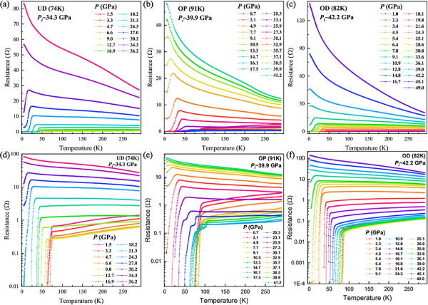 Bi2Sr2CaCu2O8+δ铜氧化物超导体在不同压力下面内电阻(R)-温度(T)依赖关系。图(a)和图(d)为欠掺杂(UD)样品的R-T曲线;图(b)和图(e)为最佳掺杂(OP)样品的R-T曲线;图e中两个台阶式的转变为2D-3D的超导跃变【Nature Physics 16(2020)295】;图(c)和图(f)为过掺杂(OD)样品的R-T曲线。