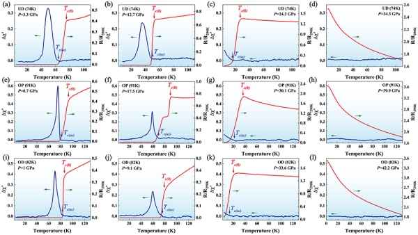 欠掺杂(UD)、最佳掺杂(OP)和过掺杂(OD) Bi2Sr2CaCu2O8+δ 铜氧化物超导体在不同压力下的原位电阻-磁化率一体化测量结果。红色为电阻与温度的依赖关系,蓝色为调制交流磁化率与温度的依赖关系。