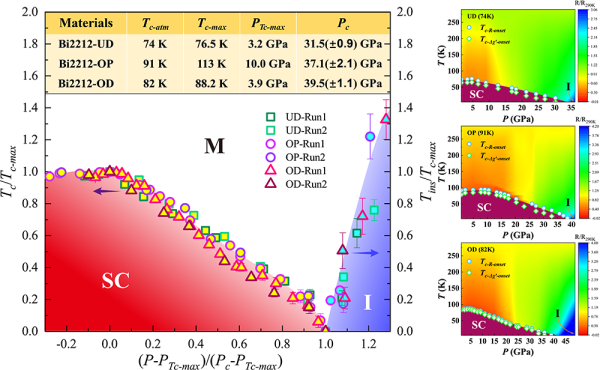 该项工作由中国科学院物理研究所/北京凝聚态物理国家研究中心超导国家重点实验室究员孙力玲研带领的团队与中科院院士向涛、研究员周兴江、胡江平等以及美国布鲁克海文国家实验室研究员顾根大和德国马普所研究员林成天合作,利用先进的高压研究手段,在Bi2212铜氧化物超导体中发现的。他们采用独立发展的高压原位电阻-磁化率一体化测量技术,对这类超导体进行了系统的研究,发现欠掺杂、最佳掺杂和过掺杂Bi2212铜氧化物超导体在较低的压力下超导转变温度(Tc)升高到一定值后开始单调下降直至被完全抑制,随之系统并没有转变成人们通常预期的金属态,而是令人意外地进入了一个类绝缘体态,超导态与这种绝缘体态通过量子相变点相连接。进一步的实验结果表明,上述压力诱导的超导-类绝缘态量子相变不仅在每个晶胞具有两层CuO2面的Bi2212系统中出现,而且在每个晶胞具有一层和三层CuO2面的Bi2201和Bi2223系统中也存在。