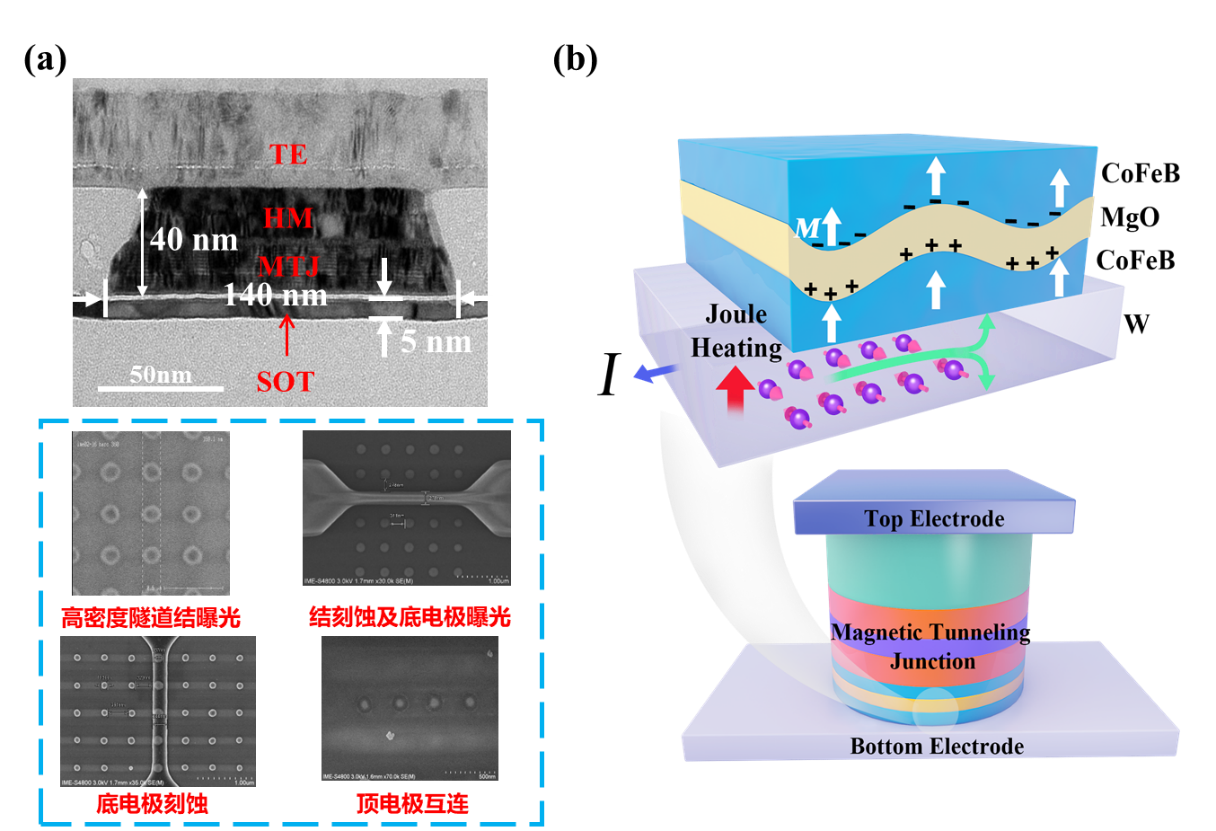 图1.(a)SOT-MTJ器件横截面TEM和部分工艺顶视图。(b)SOT-MTJ器件结构和原理示意。