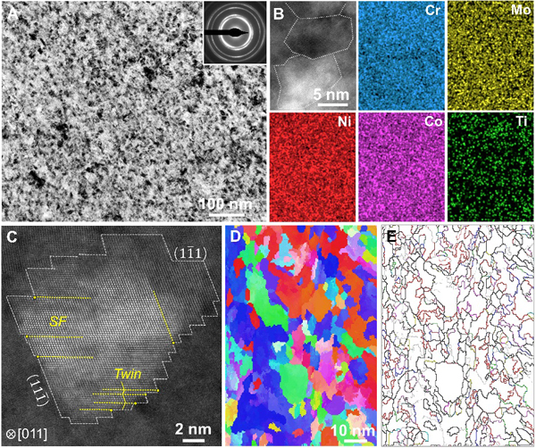 图1.具有弛豫晶界的纳米晶MP35N合金的结构