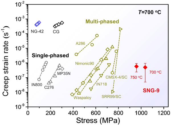 图2.具有弛豫晶界的纳米晶MP35N合金的蠕变性能,及其与其它牌号高温合金性能对比