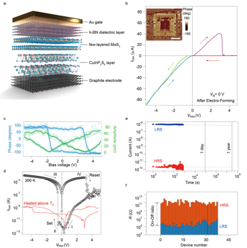 图1.器件结构设计及两端铁电忆阻器的存储性能。a、器件结构示意图;b、器件的阻变行为;c、少层CuInP2S6的压电力显微镜相位和幅值图;d、器件在不同温度下的输运行为;e、存储器的数据保持能力测试;f、存储器开关比统计图。