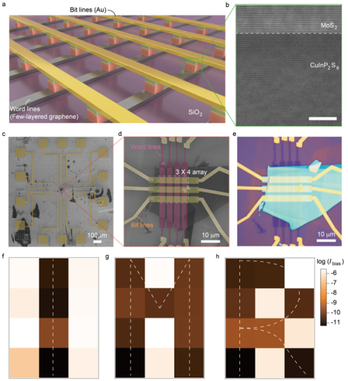 图2.铁电忆阻器存储阵列演示。a、二维铁电RAM结构示意图;b、CuInP2S6/MoS2界面的HAADF-STEM照片;c、3×4阵列的SEM图像;d、局部放大图;e、3×4阵列的光学照片;f-g、通过读取3×4阵列中每个交叉点的高阻态和低阻态编码的“I”“M”“R”的简化字母。