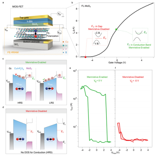 图3.器件的可编程存储特性。a、器件结构示意图;b、MoS2层的转移特性曲线;c-d、异质结的能带结构图;e-f、通过施加门电压实现了对存储窗口从有到无的调控。