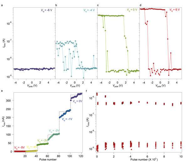 图4.门电压可编程存储器的多阻态存储特性。a-d、器件在不同门电压下的存储窗口;e、器件的多阻态存储性能演示;f、栅极调控的耐疲劳特性。