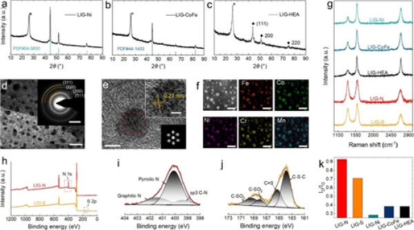 此外,制备得到的三维石墨烯材料的功能组分也具有高度的可控性。得益于液体良好的兼容性,功能性的有机或无机填料可以直接混入液态前驱体中,并在激光的辐照下原位形成石墨烯基复合材料,实现了包括杂原子掺杂、金属纳米粒子掺杂、金属氧化物纳米粒子掺杂以及其他功能性组分的掺杂等(图2)。例如,将多种金属有机化合物与液体共混之后进行激光辐照可以得到高熵合金掺杂石墨烯材料。其中,高熵合金以纳米粒子的形式均匀分布在三维石墨烯的多孔骨架表面,其粒径和含量则可以通过前驱体的掺杂比例灵活调节。