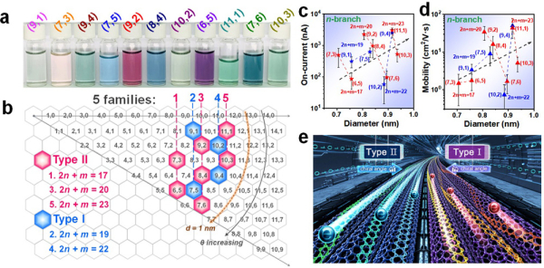 碳纳米管薄膜电学输运性能与手性结构的关系。(a)所用碳纳米管溶液照片;(b)所用碳纳米管手性结构分布;(c-d)不同手性碳纳米管薄膜场效应晶体管开态饱和电流和电子迁移率与直径关系;(e)碳纳米管电学性能与手性结构的依存关系示意图。