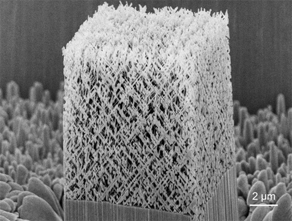 纳米晶格(Nanolattice)是一类新兴的力学超材料。由于纳米尺寸效应以及丰富的空间构型和材料选择,纳米晶格可以在更轻质的情况下实现超常的力学性质,有望在未来高性能材料领域带来变革性的应用。纳米梁晶格是纳米晶格中主要的研究对象,而长期以来,梁直径小于100纳米的金属纳米晶格的制备较难突破,其力学性质尚不清晰。