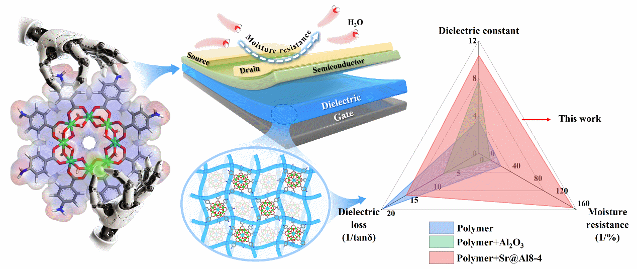 场效应晶体管是微电子技术的核心。构建具有高介电常数、低介电损耗和良好环境稳定性的聚合物复合介电材料,对于提升场效应晶体管的性能和可靠性至关重要。但是,传统的高介电常数掺杂材料,存在界面粗糙、易团聚、兼容性不足、损耗高和湿度敏感等问题。同时,由此产生的器件吸湿效应会导致介电性能不稳定,阻碍聚合物复合界面上载流子运输机制的理论研究。