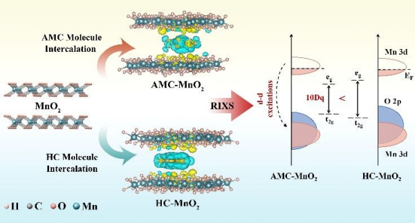 科研团队选取含吸电子基团的7-乙酰氧基-4-甲基香豆素(AMC)有机分子、含供电子基团的7-羟基香豆素(HC)有机分子作为插层剂,通过液相插层法制备得到两种插层型二氧化锰,利用密度泛函理论计算确认含吸电子基团的AMC有机分子与氧的相互作用更强,并促进Mn 3d与O 2p轨道之间杂化程度的增强。