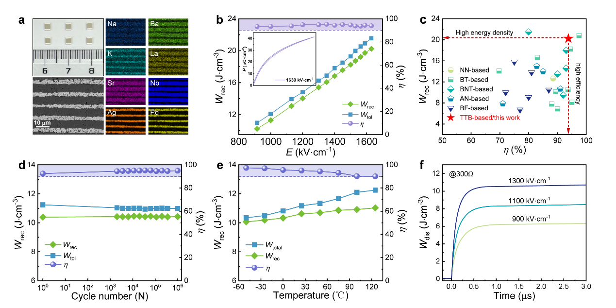 (a)TTB高熵电容器的形貌和元素分布,(b-f)TTB高熵电容器的储能和放电特性