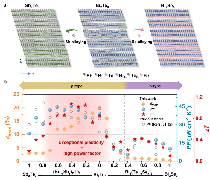 碲化铋基塑性热电材料研究取得进展2025-09-28碲化铋(Bi2Te3)基热电材料涵盖Bi2Te3及其与Bi2Se3和Sb2Te3形成的赝二元固溶体,在固态制冷、精准控温和局域热管理等方面已实现商业应用。但是,Bi2Te3基材料本征为脆性,外力作用下易发生解理破碎,限制了其在柔性/微型电子等领域的应用。此前,中国科学院上海硅酸盐研究所通过两类本征反位缺陷的互相作用,在单晶中引...