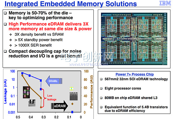 以IBM power7处理器为例,基于SOI的嵌入式存储解决方案不但获得了容量的提升,更在性能上大幅提升。