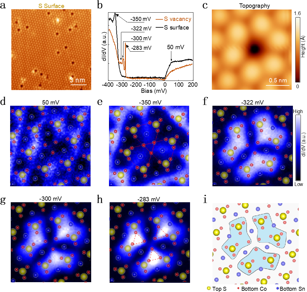 磁性量子材料的缺陷工程及其局域量子态自旋的调控,有望用于构筑未来实用化的自旋量子器件,是目前凝聚态物理研究的热点领域之一。近年来,基于过渡金属的笼目晶格(kagome lattice)化合物成为揭示和探索包括几何阻挫、关联效应和磁性以及量子电子态的拓扑行为等丰富物理学性质的新颖材料平台。在这些近层状堆叠的晶体材料中,过渡金属元素原子呈三角形和六边形在平面内交替排列,形成独特的拓扑结构,例如具有狄拉克锥的电子能带结构特征和强自旋轨道耦合的平带特征等。此外,这些材料还表现出铁磁、反铁磁以及顺磁等丰富磁性基态。研究该类材料磁性以及拓扑特性的一个有效方案是在原子尺度探究其空间局域激发态,但至今未见报道。