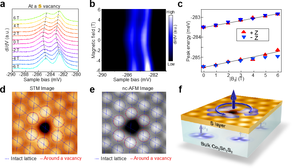 近期,中国科学院院士、中科院物理研究所/北京凝聚态物理国家研究中心研究员高鸿钧课题组博士研究生邢宇庆、副研究员陈辉、副研究员黄立等与物理所研究员刘恩克指导的博士生申建雷、美国波士顿学院教授汪自强合作,通过极低温-强磁场-自旋极化扫描隧道显微镜/谱和低温-原子力显微镜,研究了磁性外尔费米子系统Co3Sn2S2中的单原子缺陷附近的激发态。该研究首先利用非接触的原子力显微镜图像及功函数测量,确定解理产生的两种表面中的S原子终止面。进一步的自旋极化实验发现,在非磁性的S表面上围绕单原子S空位周围会形成空间局域的磁性的极化子。这些极化子表现为具有三重旋转对称性空间分布的束缚态激发的形式。此外,在垂直样品表面方向施加高达±6 T的外部磁场的实验显示,无论磁场方向朝上还是朝下,局部磁极化子的结合能都随磁场强度的增加而线性增加,这表明轨道磁化作用对局域化磁矩(~1.35μB)具有主导作用。基于这一轨道磁矩的主导作用及在S空位明显的局域磁弹效应,该研究发现一种新的激发态,即局域化的自旋轨道极化子(Spin-orbital,SOP)。Co3Sn2S2显著的局域化轨道磁化与拓扑相关的贝利曲率和拓扑磁体磁电效应的循环电流有关。非磁性原子层上的SOP会对系统的局域磁性有显著的增强,同时也增强了时间反演对称性破缺导致的奇异拓扑物性。