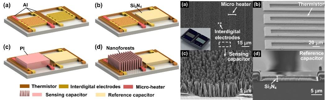 基于以上问题,微电子所陈大鹏研究员课题组提出了一种以纳米森林为湿敏材料,同时集成参比电容、微加热器和热敏电阻的新型湿度传感器。纳米森林具有超亲水性和完全开放的纳米结构,可提高湿度传感器灵敏度。该器件同时使用差值法消除寄生电容,通过热敏电阻进行温度补偿以提高传感器精度,采用微加热器进一步缩短响应时间。与传统的聚酰亚胺湿度传感器相比,基于纳米森林的湿度传感器在10-90%的相对湿度范围内,灵敏度提高了15倍,响应时间缩短至5s。该传感器还具备制作工艺简单、兼容CMOS工艺、适合批量生产等优势。