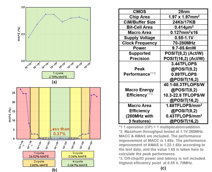 图1(a)不同数据区间POSIT8近似计算误差, (b)不同数据区间POSIT16近似计算误差, (c)芯片性能总结表格