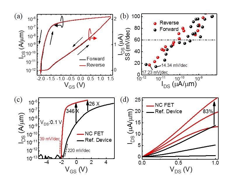 图(a) MoS2 NCFET转移曲线。(b)亚阈值摆幅~沟道电流关系。MoS2 NCFET与MoS2 FET对比数据:(c)转移曲线和(d)输出曲线