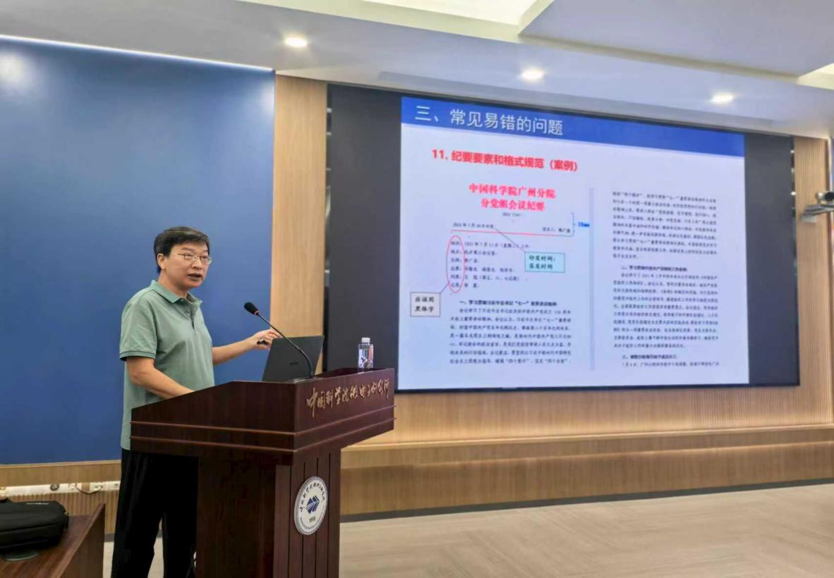 培训邀请广州分院直属机关党委原专职副书记、办公室主任郭震作了题为《规范公文处理、熟悉公文写作,服务抢占科技制高点》的讲座。讲座围绕“思想上重视公文”、“公文的概念与规范”、“常见易错的问题”、“政务信息及照片”、“材料起草与实操”等方面展开,讲解了公文的格式规范、常见公文写作要点、公文错误实例解析与修改示范、政务信息写作与照片的拍摄技巧等。