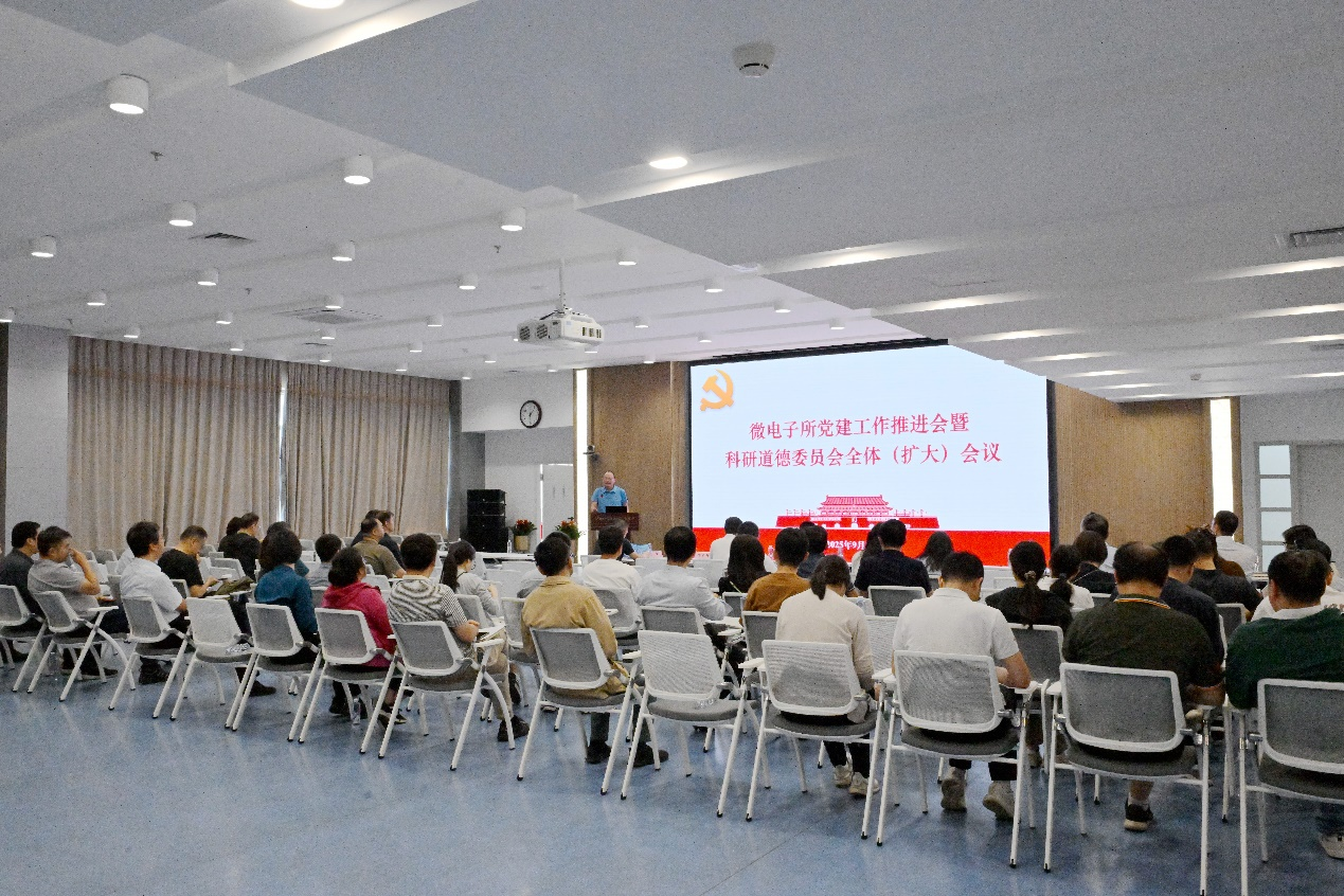 9月28日,微电子所召开党建工作推进会暨科研道德委员会全体(扩大)会议,通报2025年上半年党的建设工作进展并传达学习院党组科研诚信建设与科技伦理治理工作会议精神。所领导班子成员、党委委员、纪委委员、科研道德委员会成员以及新任党总支/党支部书记、组织委员、纪检委员等共70余人参加会议。所长、党委书记戴博伟作重点发言,党委副书记、纪委书记谢光锋主持会议。