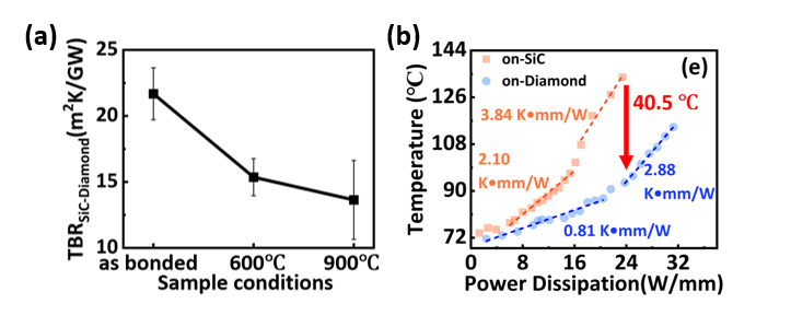 图2 (a) SiC/Diamond界面热阻随退火温度的变化;(b) 基于不同衬底(SiC 与 SiC/Diamond复合衬底)GaN HEMT 结温随耗散功率密度的变化。