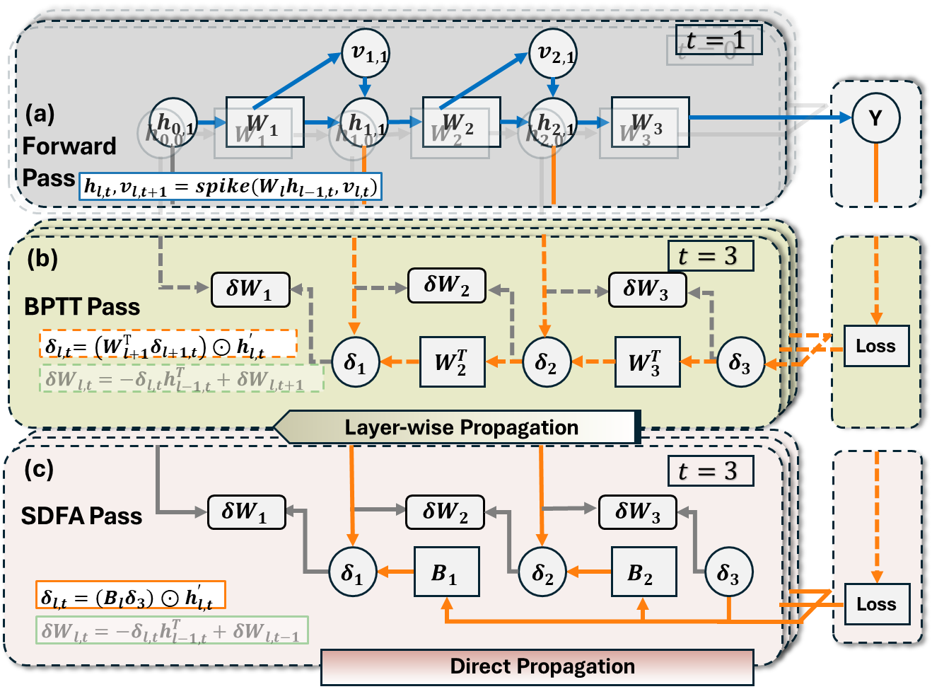 脉冲神经网络(SNNs)具有事件驱动、低能耗的特性,非常适合在自动驾驶、移动医疗等边缘计算场景中部署。在现实应用中,由于用户数据存在场景偏差,预训练的 SNN 模型往往难以直接适配个性化任务。尽管设备端训练被视为一种可行的解决路径,但在资源有限的边缘硬件上实现高效率、低功耗的训练,仍面临显著挑战。