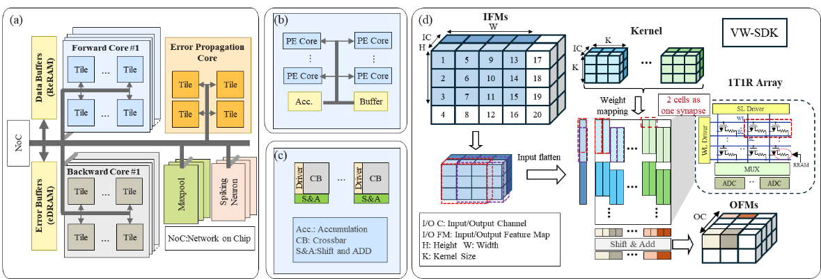 针对上述问题,中国科学院微电子研究所集成电路制造技术全国重点实验室研究团队,通过算法与硬件协同设计,在小批次学习场景下实现了边缘端脉冲神经网络的高能效训练。团队提出了一种硬件友好的训练算法——脉冲直连反馈对齐(SDFA),在误差反向传播过程中构建了直连反馈路径,其中反馈权重采用全随机矩阵,且在训练过程中保持固定,无需更新,大幅降低了计算与存储开销。在硬件层面,团队设计了名为 PipeSDFA 的高效忆阻存内计算架构,充分利用 SDFA 的算法特性,实现了时间步、数据与批处理的三级流水线并行处理。该架构还借助忆阻器件的本征随机性,高效存储固定的随机反馈矩阵。为进一步提升计算能效,团队引入了输入数据复用机制,并提出了高效权重映射方案(vw-SDK),有效优化了计算资源的利用。实验结果表明,SDFA 算法在多个数据集上保持了与基线方法相当的模型精度,损失不超过 2%。在硬件效能方面,PipeSDFA 架构相比已有的 RRAM-CIM 架构(如 PipeLayer),计算速度提升1.1~10.5倍,能效比提升 1.37~2.1倍。这一研究结果有效解决了边缘设备训练中的硬件效率瓶颈,为神经形态计算系统在资源受限环境中的实际应用提供了可扩展的解决方案。