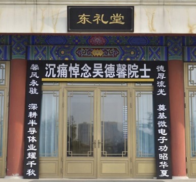 告别仪式大厅庄严肃穆,哀乐低回。正厅上方悬挂黑底白字横幅“沉痛悼念吴德馨院士”,两侧挽联凝练厚重,尽述其崇高风范与科研荣光“德厚流光 奠基微电子功昭华夏,馨风永驻 深耕半导体业耀千秋”。吴德馨院士身盖鲜红党旗,安卧于鲜花翠柏丛中。